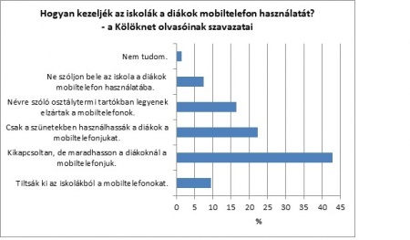 A Szavazóban legutóbb arról kérdeztük Önöket, hogy az iskoláknak hogyan kellene viszonyulniuk a mobiltelefonokhoz. A Kölöknet olvasóinak kétötöde azt a megoldást tartja jónak, ha a mobilok kikapcsolva ugyan, de a tanulóknál maradhatnak.