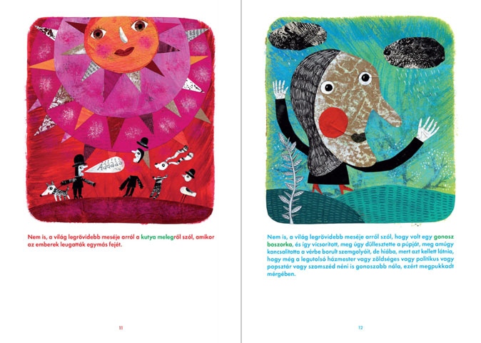 Már korábban is szerettem Molnár Jacqueline stílusát. Azonban (én) ennél a könyvnél éreztem először, hogy tökéleteset alkotott, átüt a képeken a szabadság, a fesztelenség, a játékosság. Teljesen azonos hullámhosszon van a szerzőkkel, sőt időnkét be-beszáll a heccelésbe. Például az utolsó két meséhez portrét készített róluk.