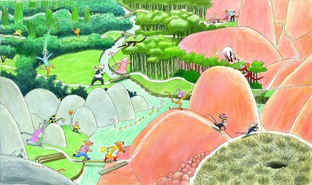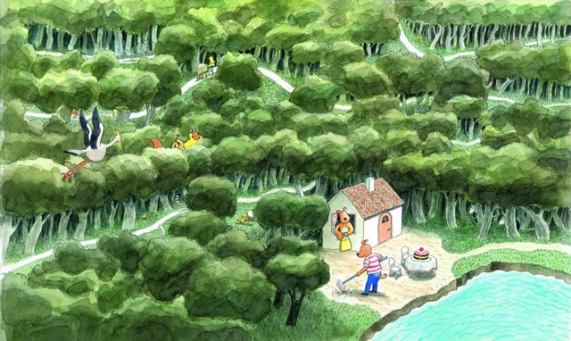 A kertben, az erdőben, a kavicshegyek között, a pataknál, a mezőn és a tóparton mindenféle szerzetek kergetik az elkóricáló, lufis kismalacot, a tolvaj majmokat, a fejbevágós focilabdát, a pityókás menyétet, a színváltós szerelmet, a lába kelt plüssnyuszit, no meg a tortát. Mindezt azért, hogy végén egy nagy, közös, tortazabáló piknikben érjenek össze a szálak. Ugye, hogy ebbe én is beleférek? A legjobb az egészben, hogy amíg itt láblógatunk két hétig ezen a bizonyos másik kontinensen egy kiskorúval, a megkerült könyv ki fog tartani minden este. Ha akarom, minden nap új mesét találunk benne. Megszámoltam, különösebb fantázia nélkül tizenhármat. Betű persze egy sincs benne. Ez egy varázskönyv. Két kérdés maradt bennem: ki tudom-e varázsolni belőle a tortát? És vajon hajlandó lesz-e a könyv hazajönni velünk, vagy elkóricál a napsütésben, tengerillatban, sivatagban?