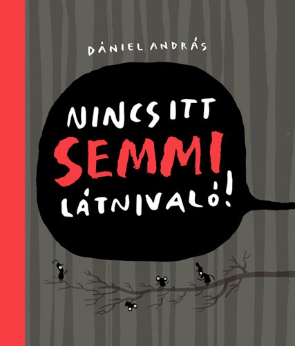 Általában évente egyszer ünnepet ül a Dániel András Sorozaton Kívüli Könyveinek Rajongói Köre, a legutóbbi ilyen ünnepet a Nincs itt semmi látnivaló! megjelenése jelentette, még ha a cím egyesek szerint arra szólít is fel, hogy ne nézzük meg a könyvet. Az első benyomásokat követően a rajongói kör megpróbálja besorolni az új művet: ez most minden bizonnyal a szépek közé fog kerülni, ami egyfelől jó neki, másfelől nem biztos, mert lehet, hogy inkább az okosak között szeretne lenni. Erről majd később, foglalkozzunk most a szépséggel! Mert a Nincs itt semmi látnivaló! szép, Dániel András elkészítette a maga fekete alapú könyvét, ami ráadásul kötészetileg is izgalmas: félvászon (tűzpiros vászonnal), a fekete lemezből készült borítón stancolt lyukkal, amiben az előzék fekete flekkjére nyomott címet látjuk. Sok illusztrátor szeretne ilyen igényes és különleges kivitelű könyvet, de a kiadók általában hamar vissza szokták őket rángatni a földre…, de ne térjünk el a tárgytól. A rajongó elégedetten látja, hogy a fekete és egyéb, de mindenképpen sötét színű lapokon a megszokott, Dániel András-i értelemben vicces rajzok sorakoznak különféle, a feketétől elütő színekben (a fehér viszont vonalként nem fordul elő a könyvben, csak pöttyként, foltként, betűként), a játékot fokozza, hogy vannak fekete alapon még feketébb részek és hasonló trükközések, minden, amit a nyomdatechnika megenged. Rá kell döbbennünk, hogy amit külön-külön feketének látnánk, az tulajdonképpen mindenféle színű. Már ebből a kevésből is érzékelhető, hogy egy igazán szofisztikált grafikai játék résesei vagyunk. Kérdés, hogy mindez szükséges-e, tényleg elmesélik-e ezek a képek egy elalvás történetét. Hát, a történet az, hogy egy kisiskolás elalvás előtt mindenfélét gondol egészen addig, hogy… de a végét nem árulom el. Ezekben a gondolatokban pedig megtalálható néhány könyv csírája, én például a frankák és krippek világáról szívesen olvasnék hosszabban, de ott van egy blődli avantgárd művészeti könyv pár lapja is Enni van hol-lal és Olyan mijó-val. Hiába ragaszkodik a grafika végig rengeteg szabályhoz (igazán fegyelmezetten!), a csapongó tartalom, egy elég eklektikus képi világot eredményez. Ez teljes mértékben indokolt, mert az elalvás előtti gondolatok nem a szigorú és higgadt következetességükről ismertek, így az eklektika egy lehetséges leképezésük; de annyira megrángatják a figyelmet, hogy a könyv végére azt éreztem, hogy most egy darabig csak jó vastag, apró betűs, szigorúan képek nélküli regényeket szeretnék olvasni. De ez azért gyorsan elmúlt.