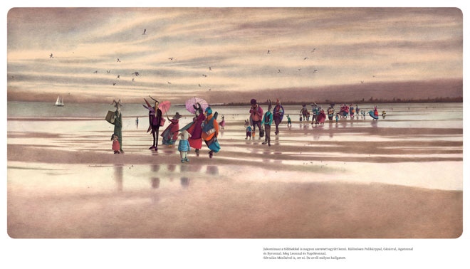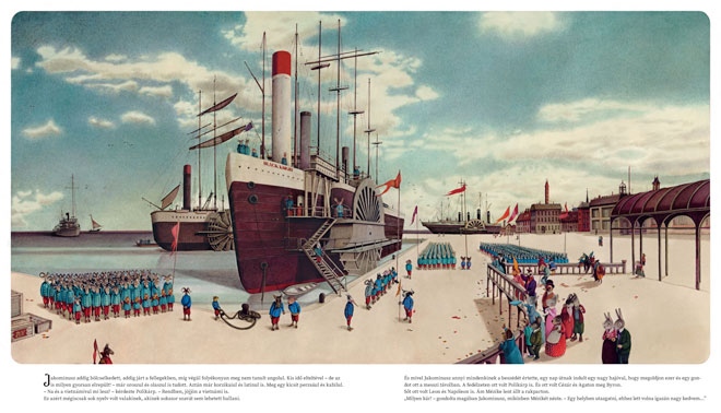 Ugyan már utaltam az albumjellegre, a könyv pontos mérete: 29 x 33,5 cm. (Persze ez a francia közönségnek nem kuriózum, sorra jelennek meg ilyen és ehhez hasonló méretű gyerekkönyvek náluk.) Ez a kötet nem működne más méretben, hiszen a kevés szöveges részt részletgazdag, monumentális, festményeket idéző, oldalpárokat kitöltő illusztrációk váltják. Sokszor többet mondanak el Jakominusz életéről, mint amit a szöveg, más nézőpontokkal, további olvasatokkal szolgálnak. Szándékosan nem írok példákat, nem szeretném senkitől elvenni a felfedezés és gondolkodás örömét.