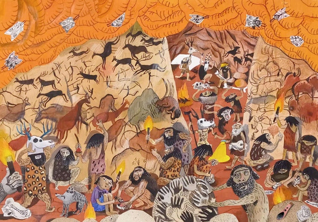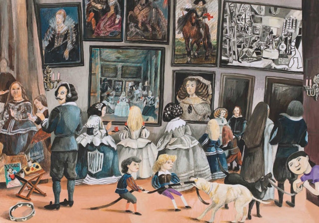 A könyv lelkét a böngészőoldalak (oldalpárok) jelentik, melyek mindig alkalmazkodnak az adott kor és alkotó karakteres stílusához. A képek állandó szereplője az illusztrátor alteregójának lánya (vagy lányának alteregója), aki időutazóként majd minden képen jelen van. Mivel a szöveg az ő és az anyukája beszélgetése, így ez a jelenlét egyfajta folyamatos önreflexió. Számunkra azért is érdekes, mert állandó viszonyítási pont az egyes stílusokhoz. A képek mértéktartóak, elég gazdagok ahhoz, hogy hosszan lehessen böngészni, felfedezni őket, de nem mennek el a tobzódásig, a vizuális káoszig. A böngésző jelleget azzal is erősíteni akarták az alkotók, hogy a képeken három-három anakronisztikus motívumot helyeztek el. Szerintem az ilyen bakikeresés inkább kontraproduktív, nehezen hiszem, hogy egy korszak episztéméjét azon keresztül látnánk meg, hogy mi nem létezhetett akkor, viszont a konkrét keresés beszűkíti a figyelmet, épp a szabad felfedezést akadályozza. Néhány esetben kifejezetten bezavarnak ezek a motívumok, pl. amikor kifejezetten bántó Velázquez fején a fejhallgató, hiszen ő annak a képnek és fejezetnek a főalakja. Szerintem a képek enélkül a plusz feladat nélkül is elég beszédesek, motiválóak lettek volna.