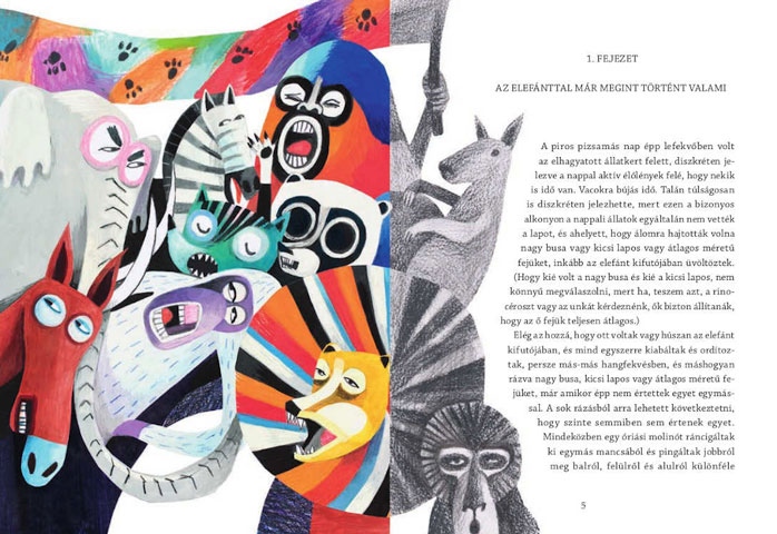 A kötet illusztrációi is roppant nyüzsgőek, ugyanakkor a lehető legjobb mértékben dinamizálják az olvasásélményt. Grela Alexandra illusztrációi – melyeket nem mellesleg lélegzetelállítóan gyönyörűnek tartok – az ábrázolás görbéivel és a piros-kék dominanciájú színkompozícióival zseniálisan egyben tartják a nagyon sok különböző állatalakból felépülő, mozgalmas, sokszereplős jeleneteket. Hogy a könyv megkapta a két egeret tőlünk, az illusztrációnak köszönhető.