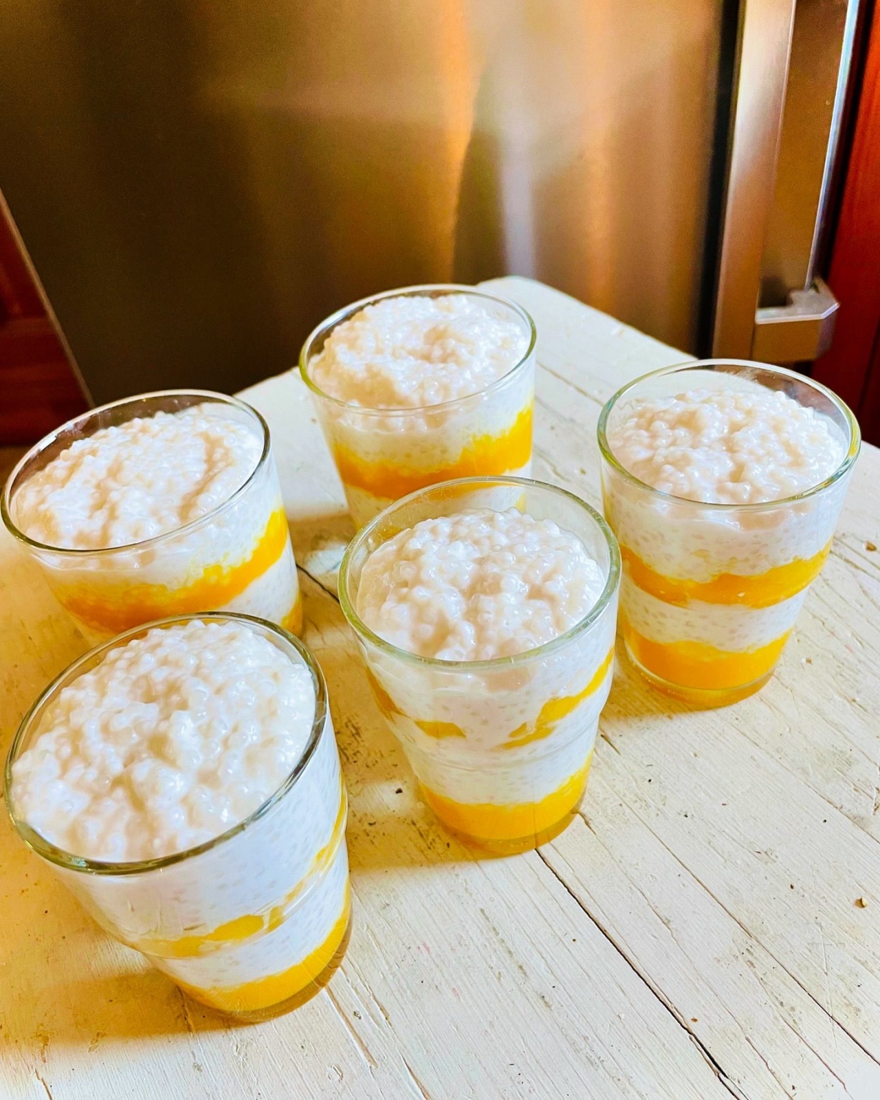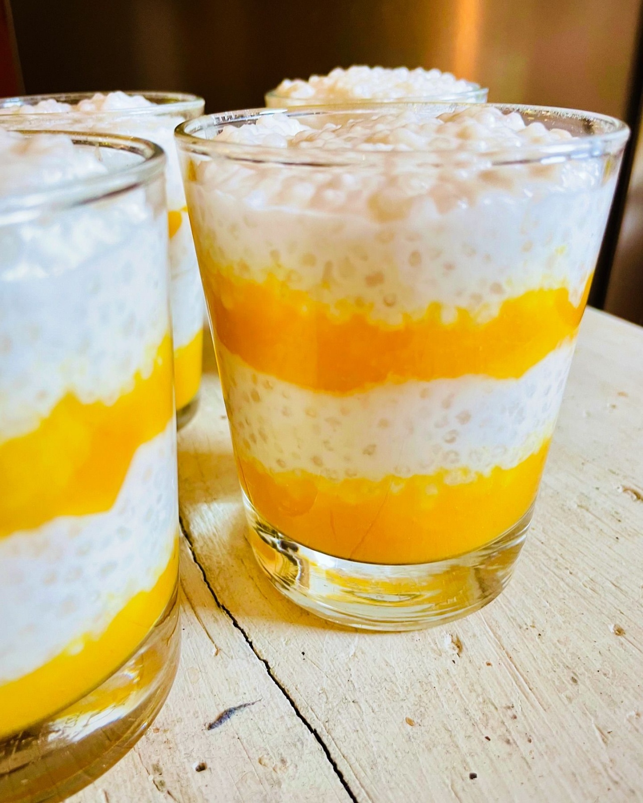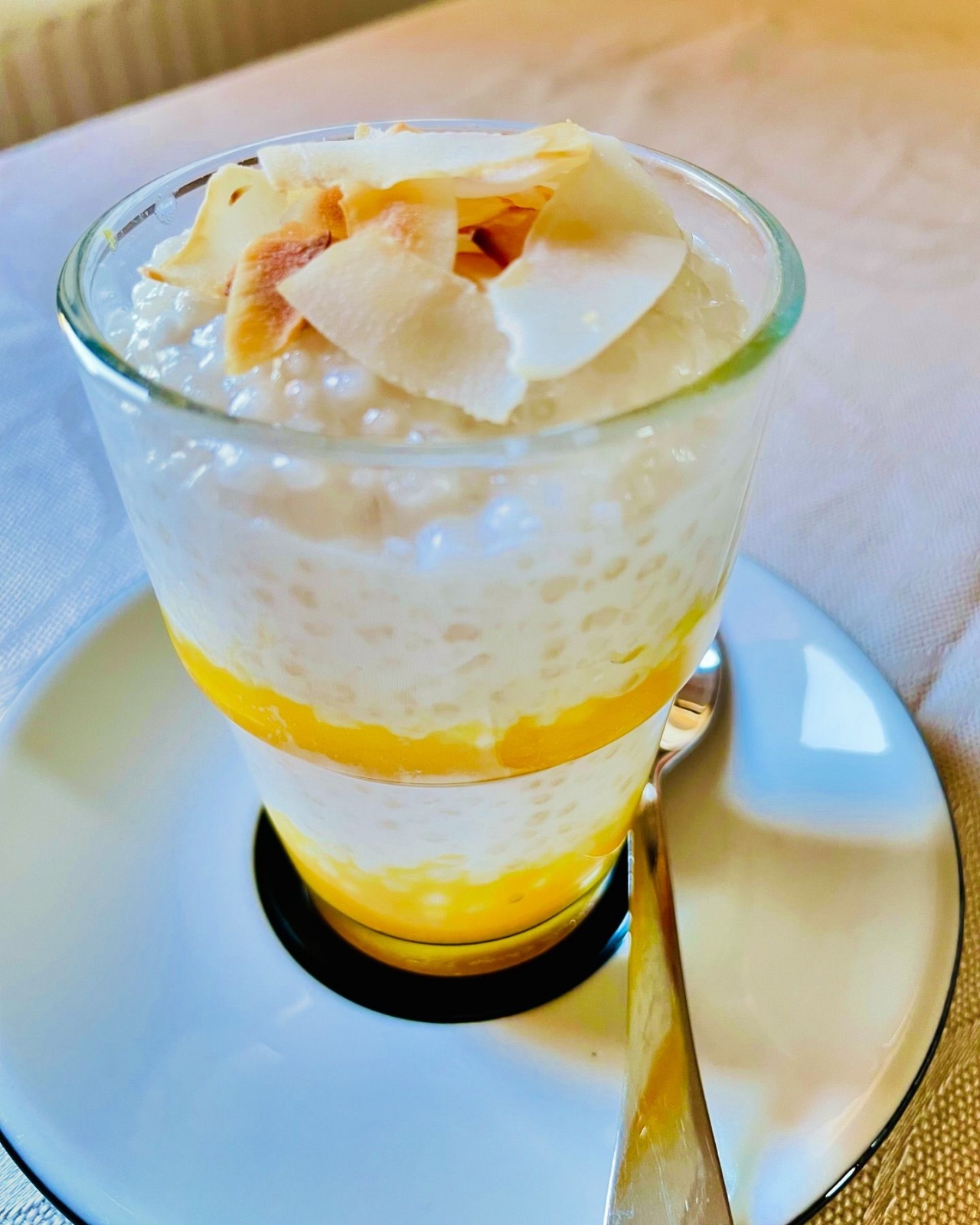Kókusztejes tápiókapuding mangópürével és pirított kókuszcsipsszel