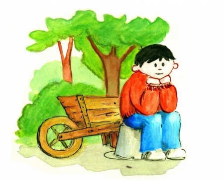 Történt egyszer, hogy a kisfiú azt gondolta: akkor elmegyek világgá, és amikor visszatérek, megmutatom nekik, hogy sokkal erősebb és ügyesebb lettem, mint ők. Kiment a kertbe, fogta a talicskát, beleült és arra gondolt, hogy ez egy varázstalicska. Erősen arra összpontosított, hogy a talicska átváltozzon, felemelkedjen és elvigye őt messzire, a mesék birodalmába.