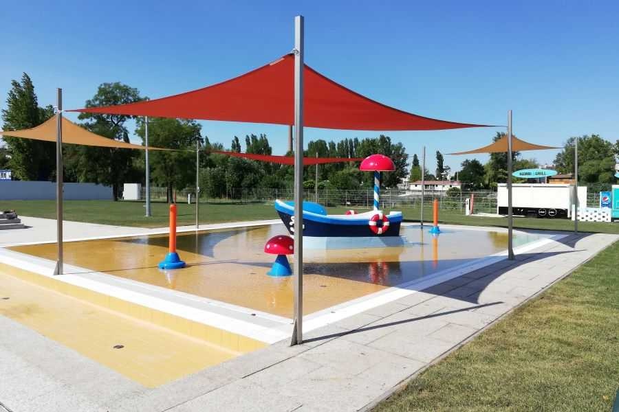 A gyerekpancsolót (30-32 Celsius, 0-0,2m) napvitorla árnyékolja, ahol a kicsik egy izgalmas mesehajó és óriásgombák között játszadozhatnak.
