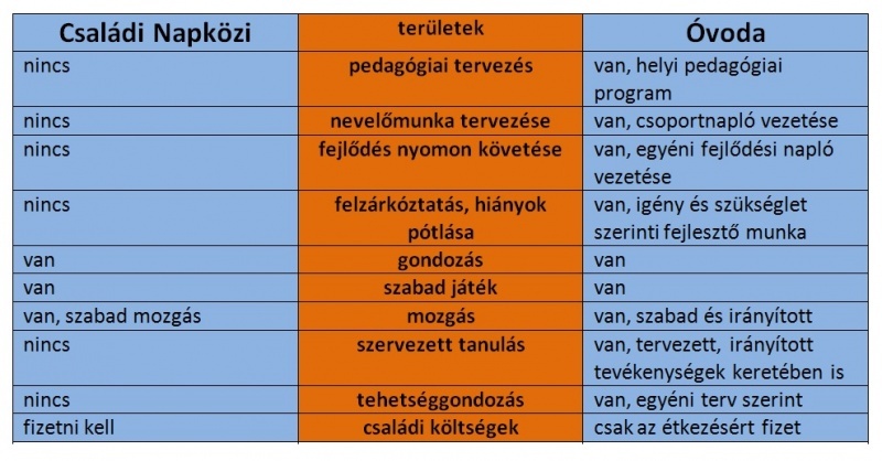 A következő táblázatban a két gyermekellátási szerveződés előírások szerinti tartalmi működésének összehasonlítása található: