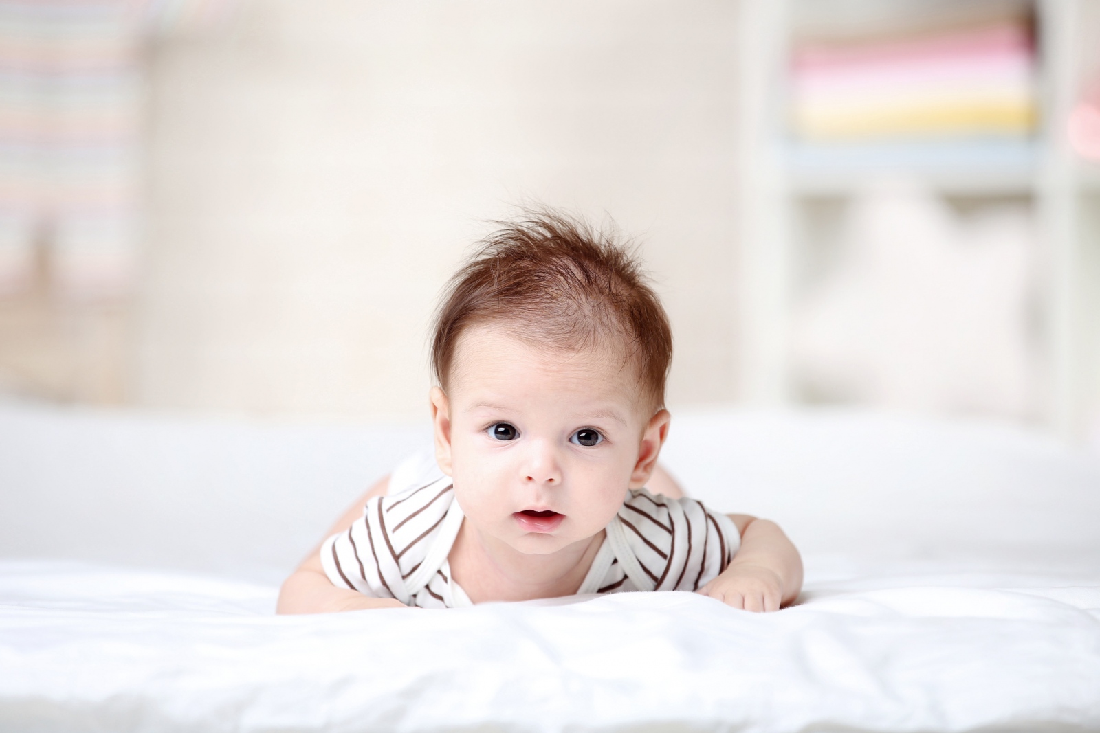- A gyermek a felsőtestét a karjaival megtámasztva hason fekvő helyzetben tartja, és hosszabb ideig tarja a fejét.