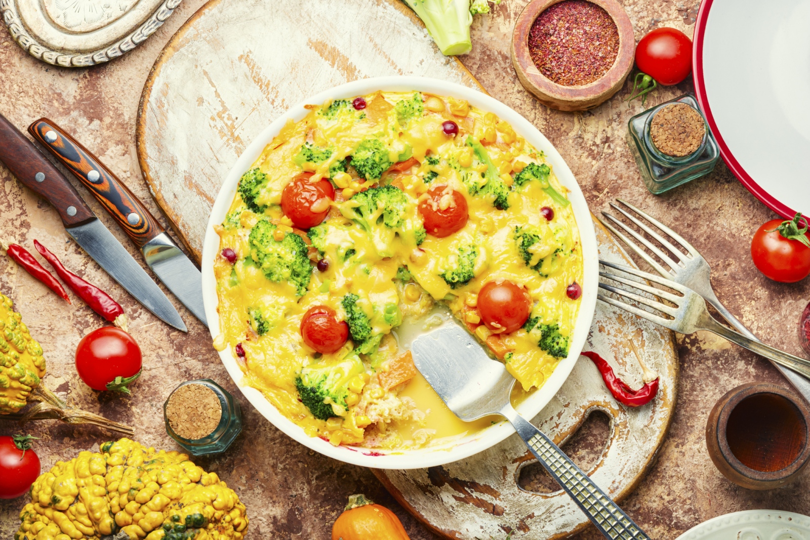 Maradék sült sütőtököt belekeverünk a felvert ízesített, fűszerezett tojásba. Olívaolajon megfuttatjuk a paradicsomszeleteket, ráöntjük a tojásmasszát, majd megsütjük az egyik oldalát. Óvatosan (tányér segítségével) megforgatjuk a félig megsült omlettet, végül készre sütjük. Pirítóssal, reszelt sajttal tálaljuk.
