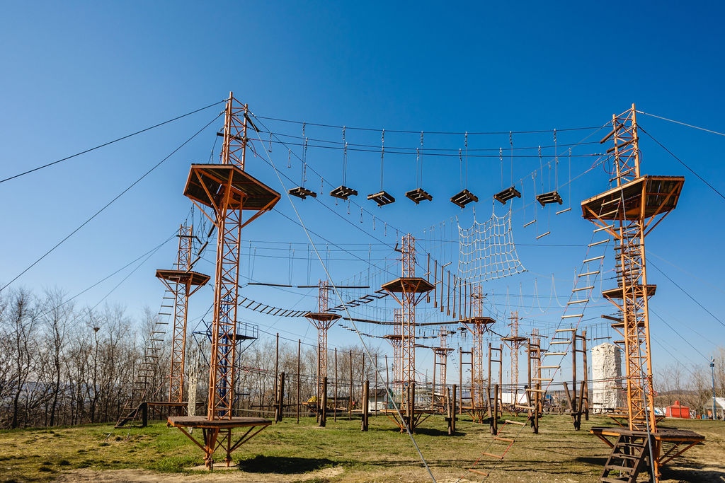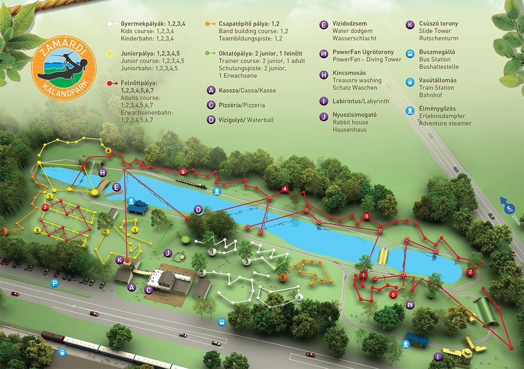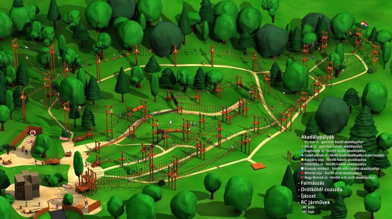Összesen 18 kalandpálya lett kialakítva külön kisgyerekeknek, junioroknak, felnőtteknek csoda szép erdei környezetben - a fák közötti kötélhidak és más eszközök segítségével lehet a bátorságot próbára tevő akadálypályákon végighaladni. Ezentúl ugrótorony, kalandos útvesztő, élménygőzös, óriás vízi golyó, vízihenger, kincsmosás és megannyi élmény várja a gyerekeket. A misztikus és rejtélyes "kincsek" egy homokkal teli zsákba lettek elrejtve, amit a gyerekeknek kell kimosniuk a kalandpark forrásánál egy szita segítségével.