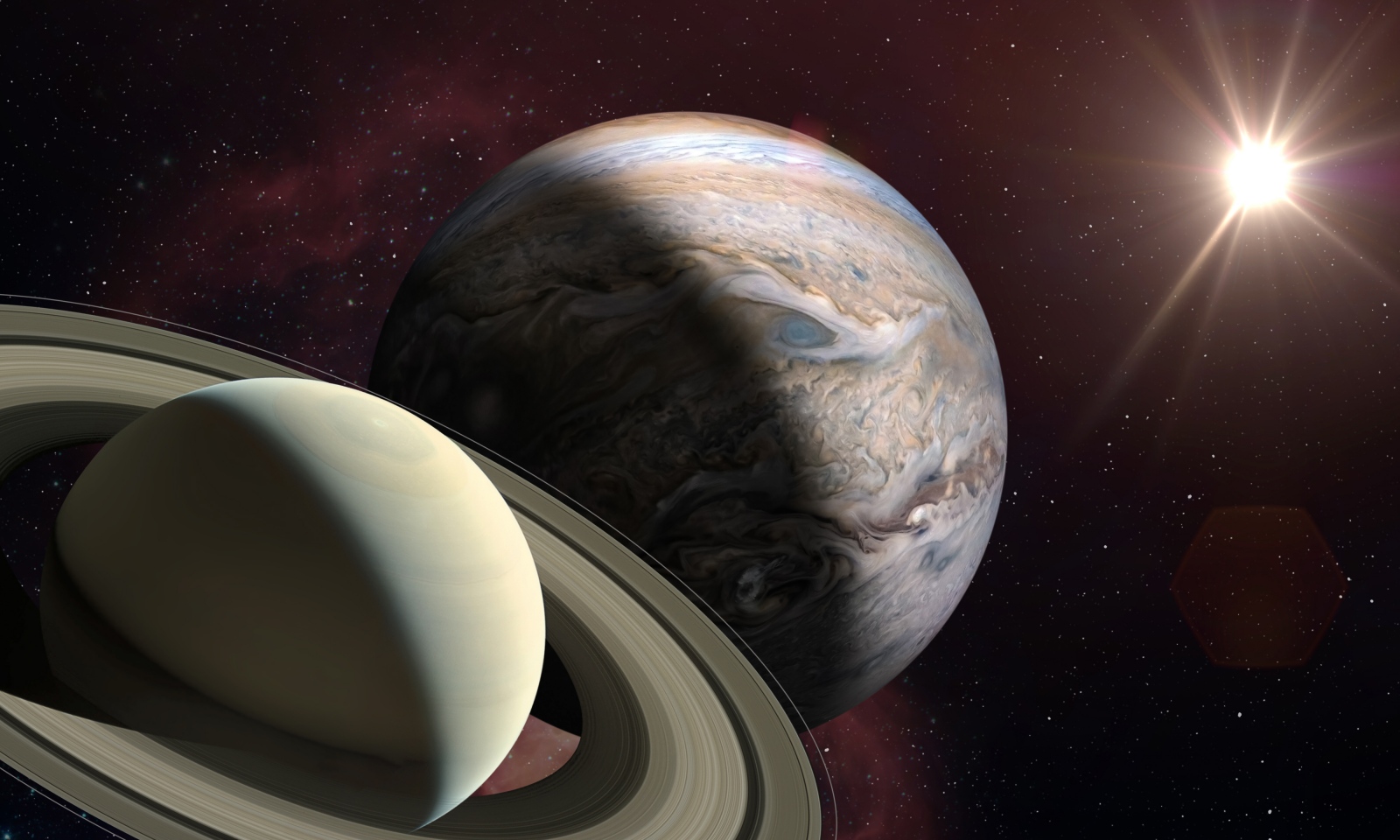 Jupiter és Szaturnusz találkozása a napfordulón. Ritka Jupiter-Szaturnusz együttállás. A kép forrása: Getty Images/NASA.
