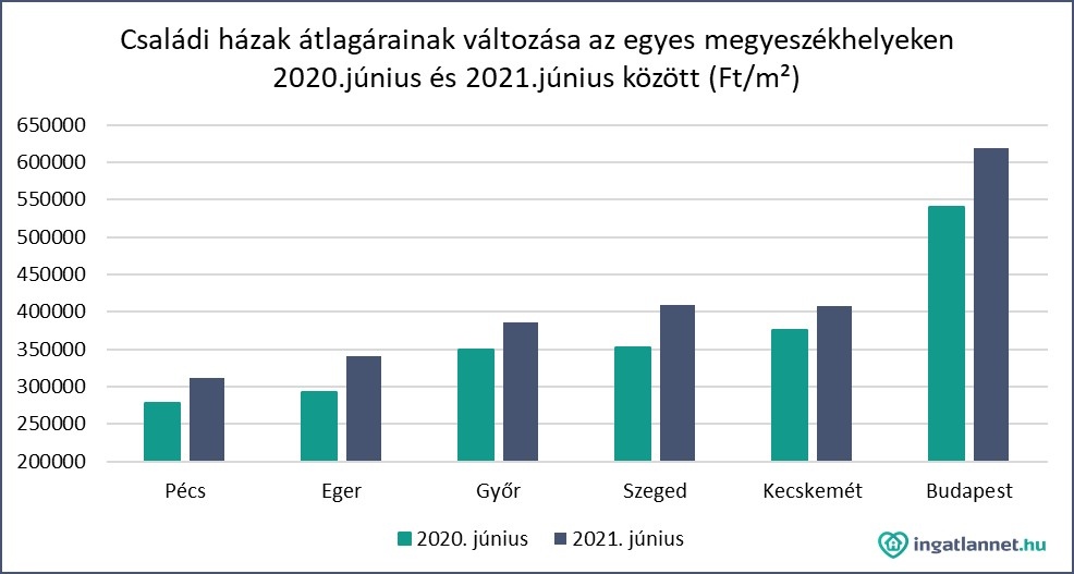 A fővároshoz hasonlóan Pécsen, Egerben, Győrben, Szegeden és Kecskeméten is többet kellett fizetni az ingatlanokért. Pécs házainak 2021-es átlagára eddig 320 ezer Ft/m², a győrieké pedig 385 ezer Ft/m², a kecskemétieké 408 ezer Ft/m² körül alakult. Egerben az idei évben megugrottak a családi házak átlag négyzetméter árai, méghozzá a 12 hónap alatt 12-13 százalékkal 330-340 ezer Ft/m²-re drágultak meg. A legnagyobb mértékű drágulás Szegeden volt az elmúlt egy éves időszakban a legnagyobb mértékű az áremelkedés. A vizsgált periódusban 15 százalékkal növekedtek a szegedi házak átlagára, ami azt jelenti, hogy 2021 júniusában átlagosan 410 ezer Ft/m²-be kerültek.