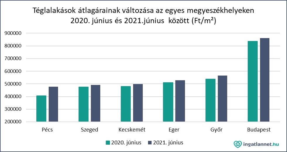 Ami a téglalakásokat illeti, a legkisebb mértékű drágulás Szegeden, Kecskeméten és Egerben volt. Ennek következtében idén júniusban Szegeden a téglalakások 492 ezer Ft/m², Kecskeméten 498 ezer Ft/m², Egerben pedig 529 ezer Ft/m²-es átlagáron kerültek kínálatra. Győr eladó lakásai– a házakhoz hasonlóan – drágulóban vannak még, egy teljes év alatt 30 ezer Ft/m²-rel emelkedett meg az átlagáruk 565 ezer Ft/m²-re. Pécsen viszont már jóval magasabb ár növekedés fedezhető fel, melynek eredményeképpen 2021 hatodik hónapjában egy téglaépítésű lakás egyetlen négyzetméteréért 479 ezer forintot kértek el a tulajdonosok.