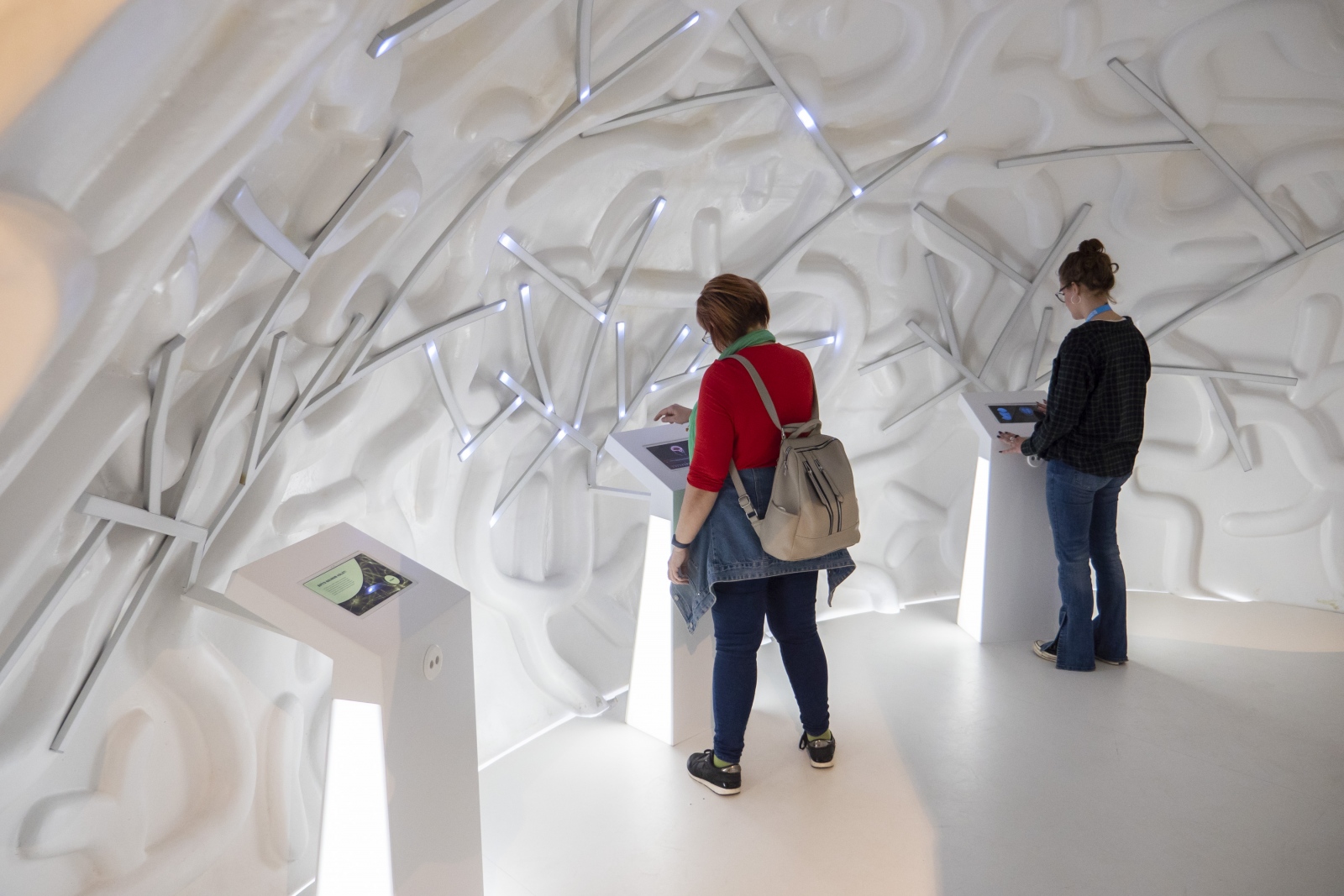 A kiállítás attól interaktív többek között, hogy a leíró táblák mellett érintőképernyők is segítenek az ismeretek feldolgozásában. És miért ne állhatnának ezek a képernyők az emberi agy modelljének belsejében?