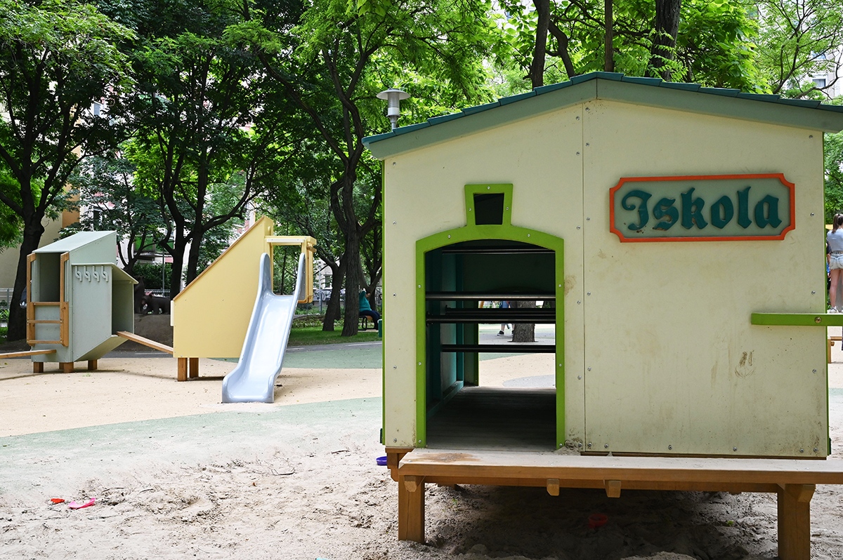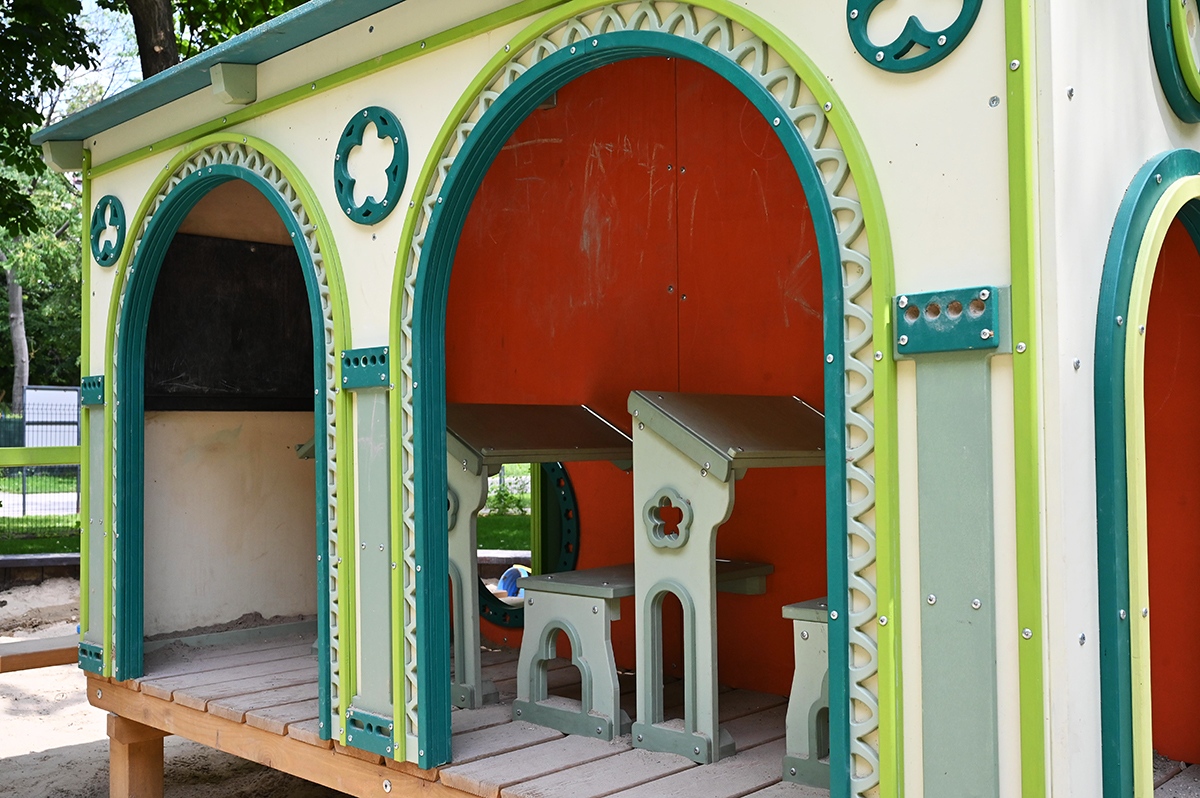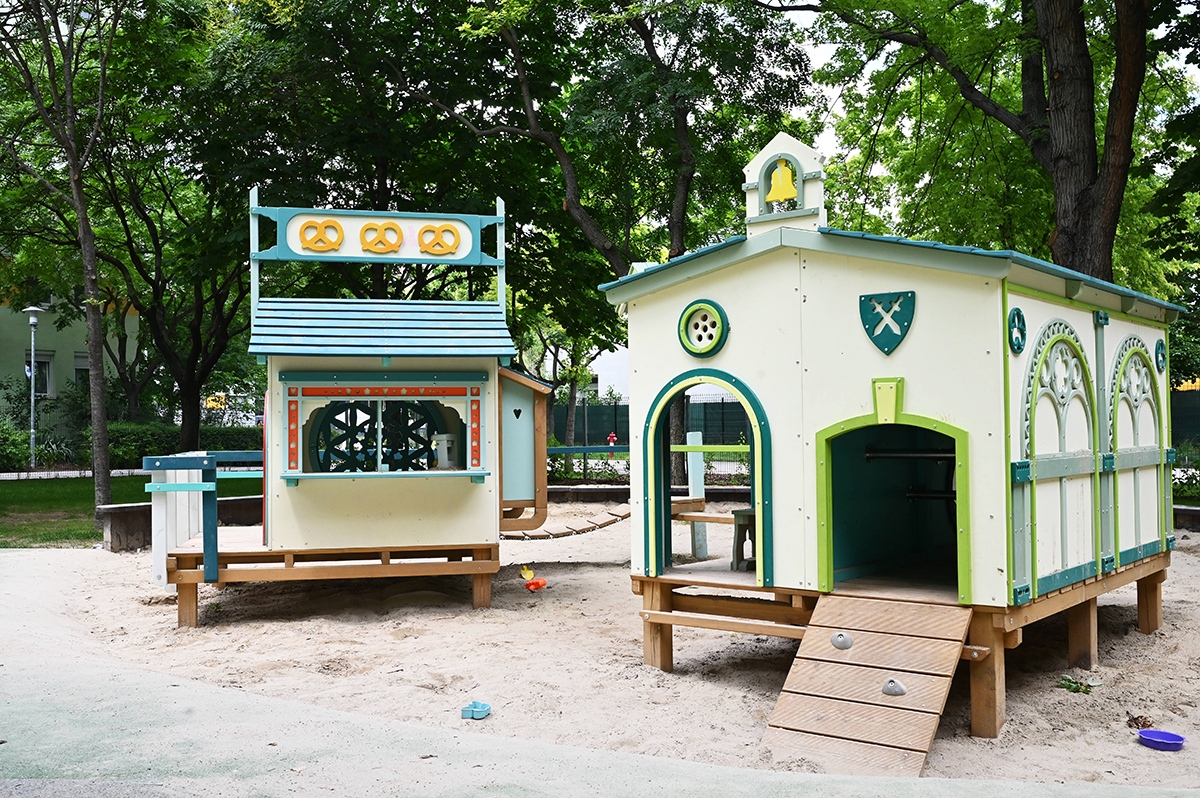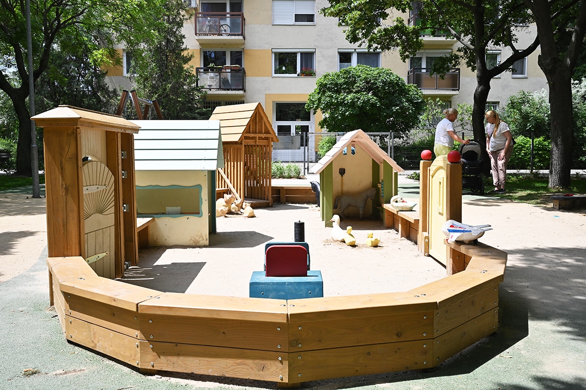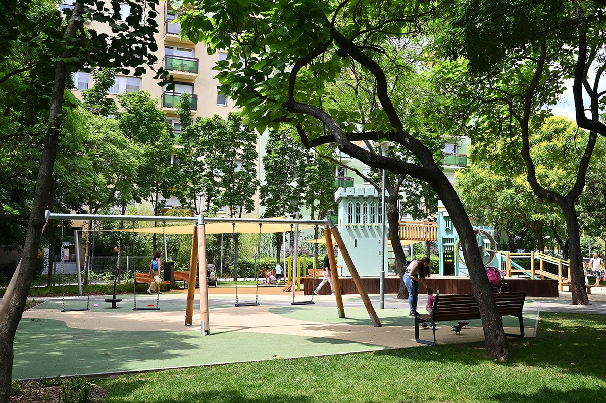 Mindkét játszótérrészen napvitorlával fedett homokozót alakítottak ki, de a hatalmas fák is elegendő hűs árnyékot biztosítanak a legnagyobb melegben.