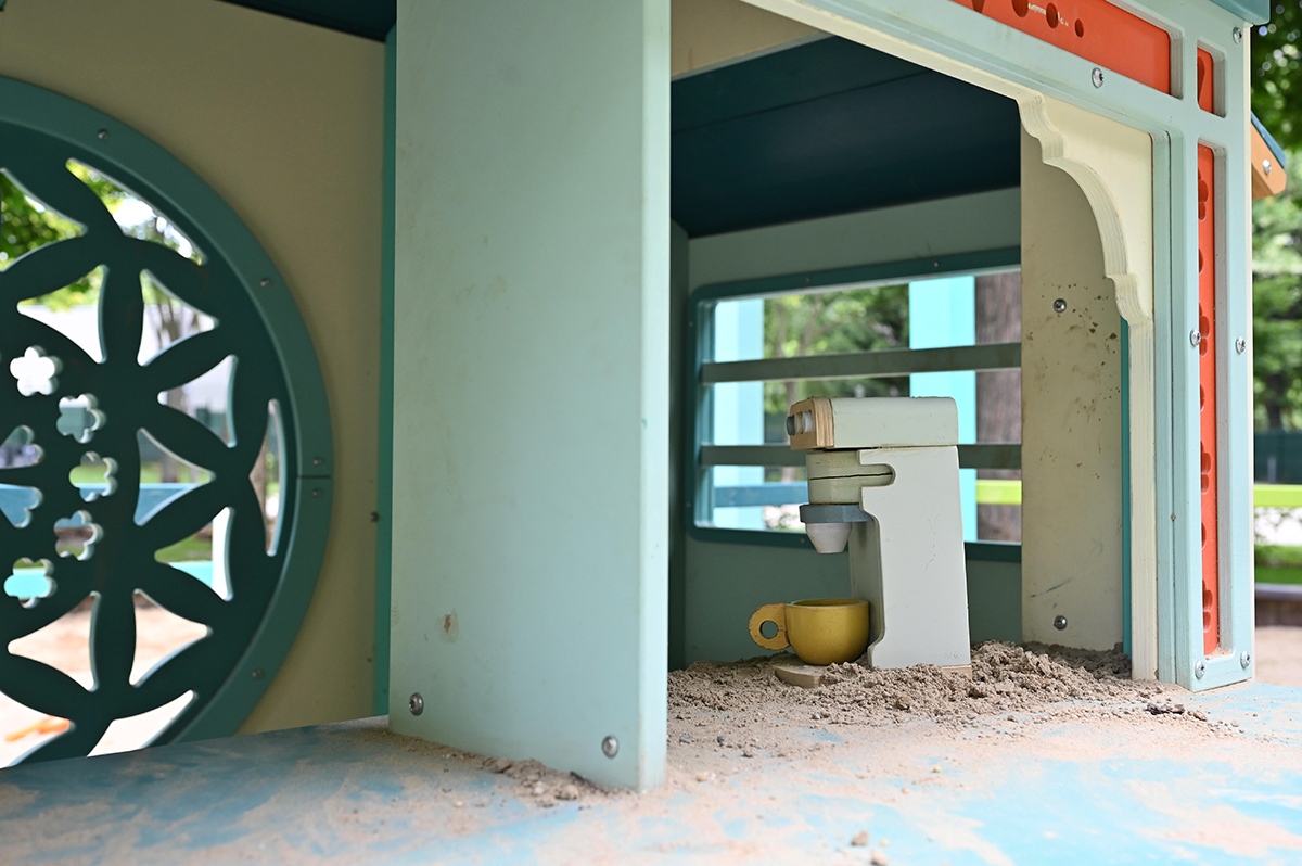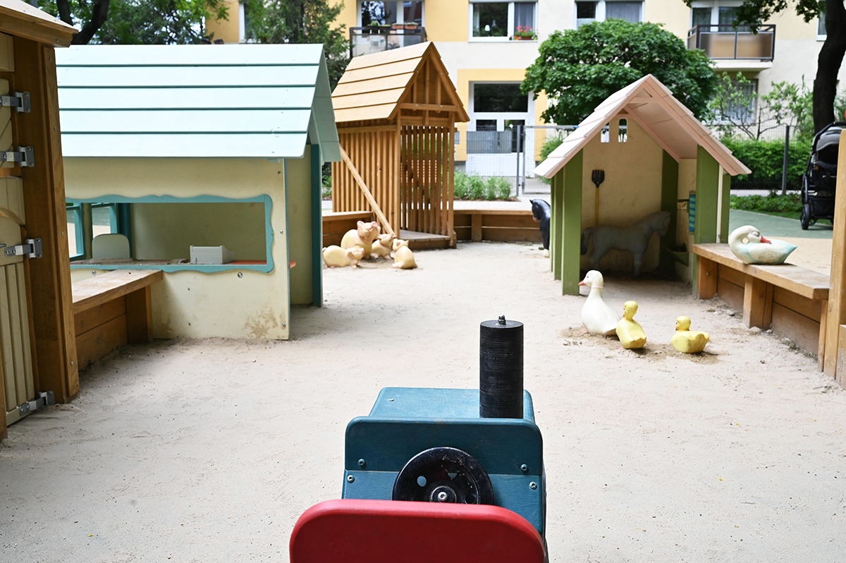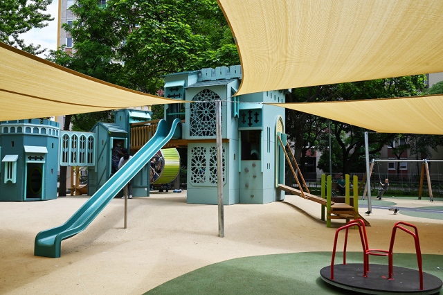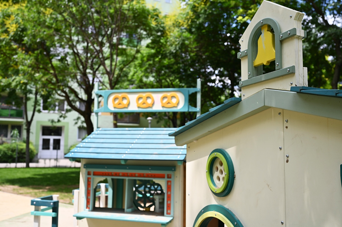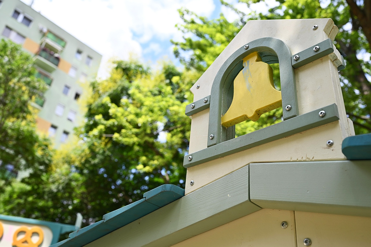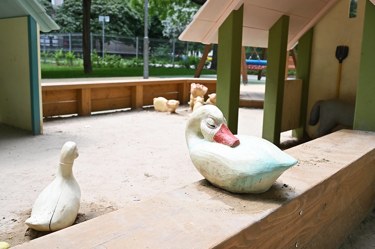 Mindkét játszótérrészen napvitorlával fedett homokozót alakítottak ki, de a hatalmas fák is elegendő hűs árnyékot biztosítanak a legnagyobb melegben.