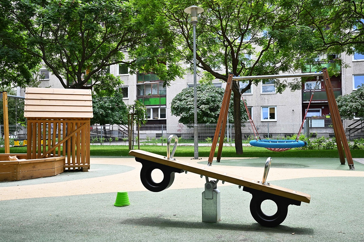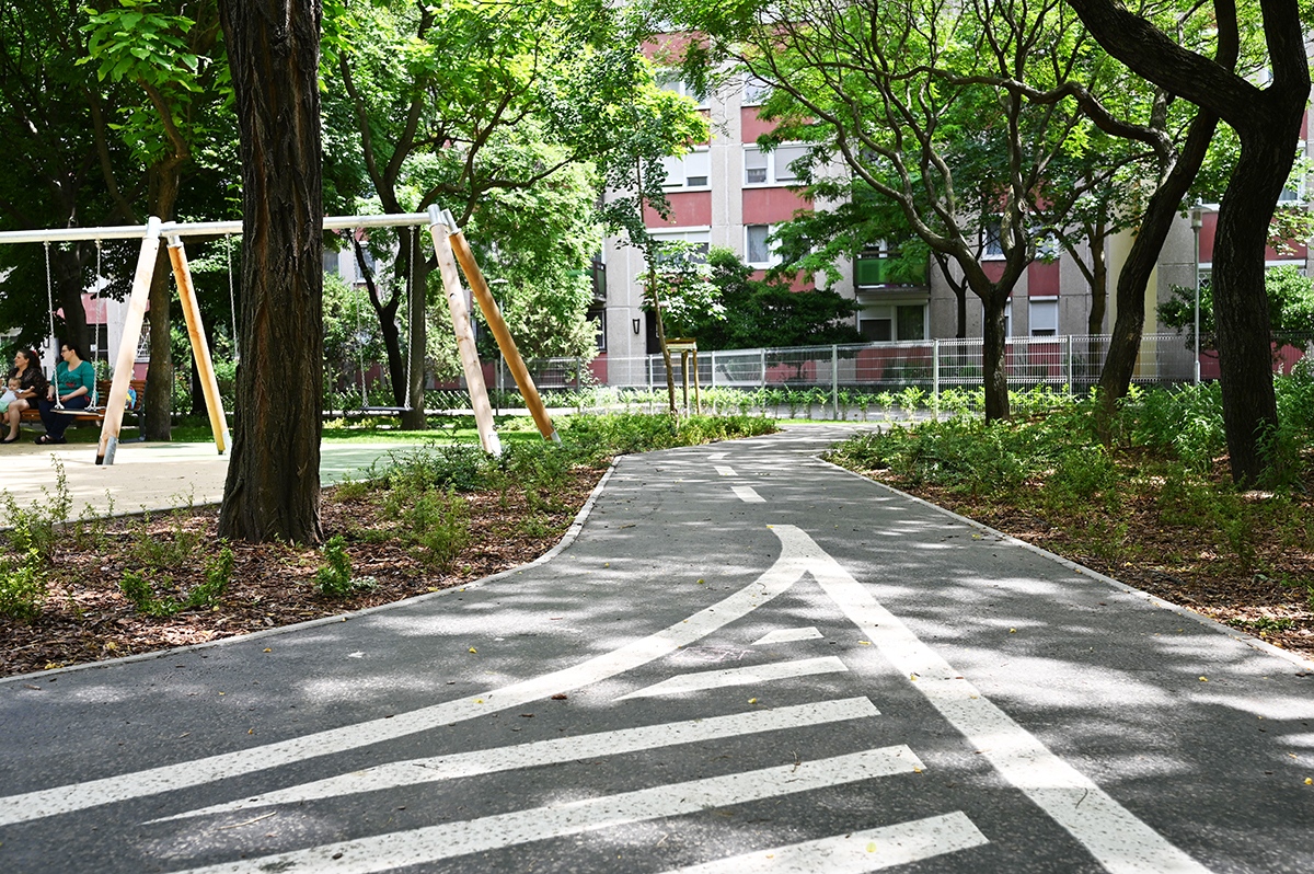 A játszótéren a 180 négyzetméteres járófelület térkő burkolatot kapott, 250 négyzetméteren a játszóeszközök alatt öntött gumiburkolatot alakítottak ki. Ezen kívül a 191 négyzetméteres motorpálya aszfaltburkolatot kapott. A játszótéren a kombinált és interaktív egyedi játékeszközök változatos funkciókat kínálnak, és izgalmas játéklehetőségeket nyújtanak a gyerekek számára. A fenntarthatóság jegyében a meglévő játszóeszközök közül egy fészekhinta, egy forgójáték és egy trambulin megmaradt.