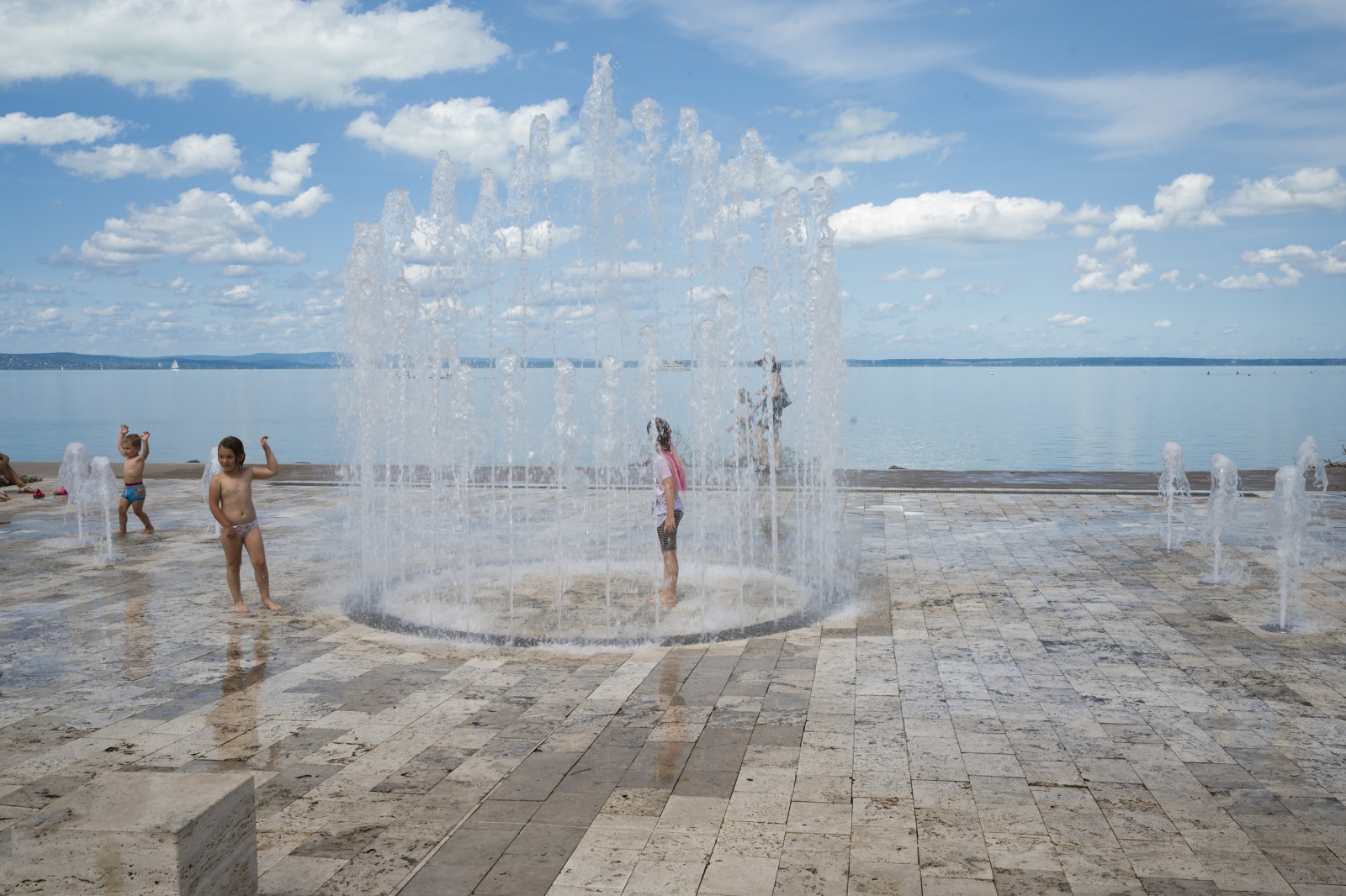 Az óriáskerékhez közeli Petőfi sétányon minden gyerek szívesen kipróbálja a szökőkút-fürdőzést Fotó: Kölöknet / Fodor Cini