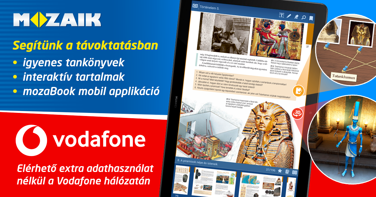 A Vodafone Magyarország stratégiájának része, hogy külső tartalomszolgáltatókkal kötött együttműködések segítségével az országban korábban nem ismert szolgáltatásokat kínáljon ügyfelei számára. Ennek részeként újabb mérföldkőhöz érkezett a szolgáltató, hiszen az audiovizuális tartalomszolgáltatók mellett most az oktatás területén is együttműködési megállapodást kötött. A Vodafone Magyarország és a Mozaik Kiadó célja közös: a társadalmi egyenlőtlenségek kiküszöbölése érdekében a következő nemzedék minőségi oktatási tartalomhoz való hozzáférésének biztosítása és digitális készségeinek fejlesztése. Az új Digitális Oktatás Csomagok részeként korlátlanul hozzáférhető a Mozaik Kiadó digitális oktatási platformja a mozaWeb, mely több mint 1200 interaktív háromdimenziós jelenettel, 1200 videóval, 120 tantárgyspecifikus applikációval és játékkal, 780 hanganyaggal, 5300 képpel, illetve számos teszttel és feladatsorral segíti a digitális térben történő oktatást és tanulást. Ezeken felül a csomagok digitális tankönyvet is tartalmaznak (1 vagy 5 választható kiadvány), melyek az interaktív tartalmakkal kiegészülve segítséget nyújtanak a tananyag könnyebb feldolgozásához, valamint a megszerzett ismeretek elmélyítéséhez és gyakorlásához.