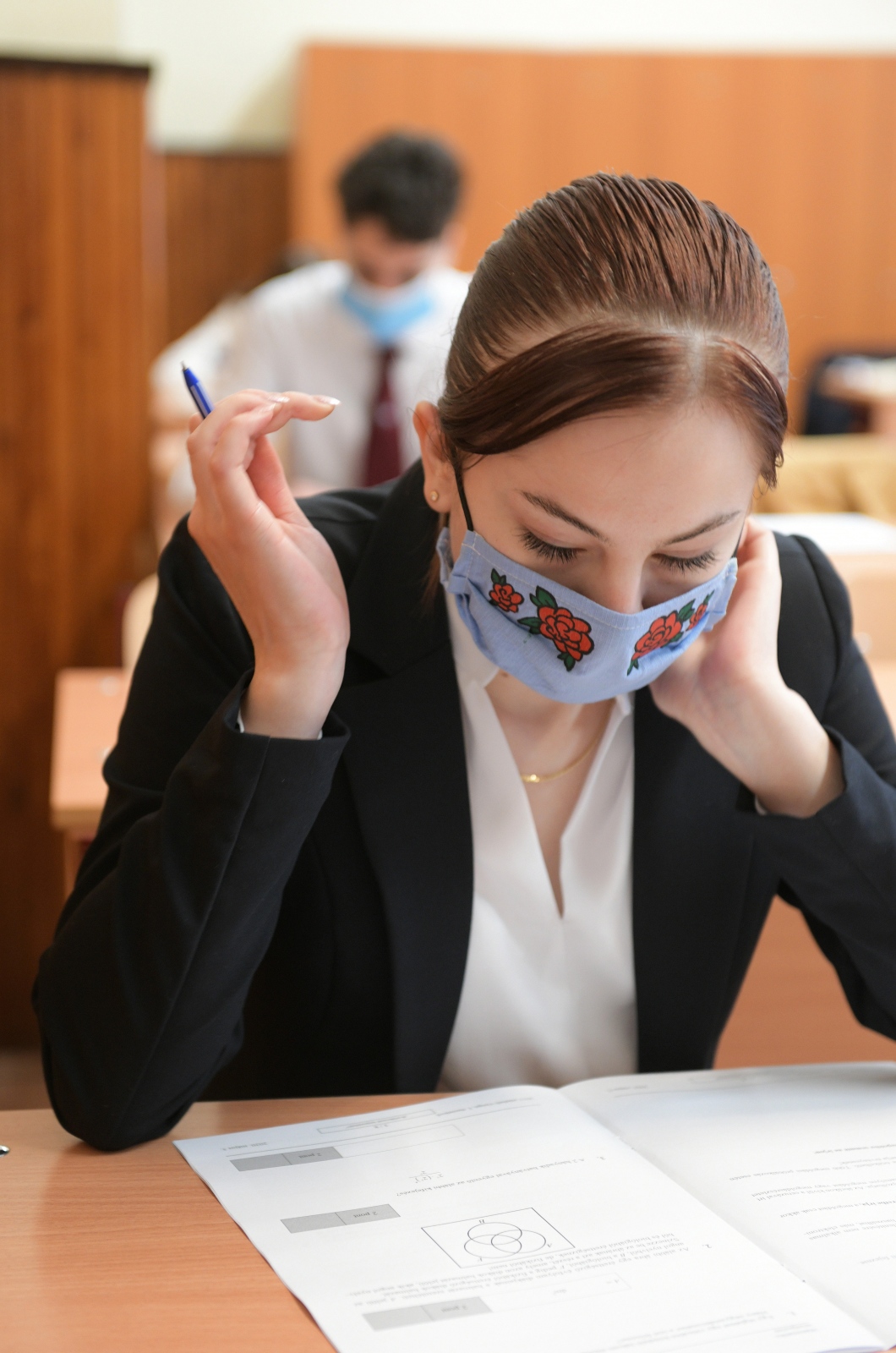 Kiosztják a tételeket a matematika írásbeli érettségi vizsga előtt a debreceni Ady Endre Gimnáziumban 2020. május 5-én.