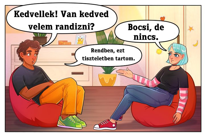 Segíts a fiadnak gyakorolni azt, hogy minél egyszerűbben ki tudja magát fejezni. "Kedvellek. Szeretnél...?" közvetlenül, de nem túl határozottan. Tanítsd meg neki, hogy tartsa tiszteletben más emberek választását, bármi legyen is az. Mondd meg neki, ha az illetőt nem említi, ne kérdezze meg, miért, és ne próbálja megváltoztatni a véleményét. És fontos megértenie, hogy mindez rá is ugyanúgy vonatkozik!