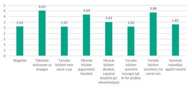 Arra kértük a kérdőív kitöltőit, hogy egy ötfokozatú skálán értékeljék, mennyire igazak rájuk különböző, tanulási módszerekkel, tanulási stílussal kapcsolatos állítások (1 – egyáltalán nem igaz, 5 – teljes mértékben igaz). A 3. ábra az ezen állításokra adott értékelések átlagát szemlélteti. Jól látszik, hogy a kérdőív kitöltői az anyag többszöri elolvasásával tudnak/szoktak a leghatékonyabban tanulni (átlag = 4,3), s tanulás közben preferálják a csendes környezeteket (átlag = 3,9). Sokukra jellemző, hogy olvasás közben jegyzeteket (átlag = 3,7) vagy épp ábrákat, rajzokat (például elmetérképeket) készítenek (átlag = 3,0).