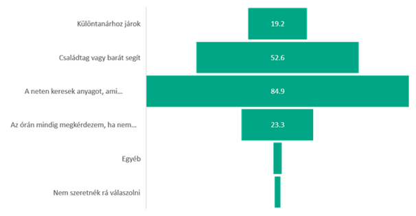 Azt is megkíséreltük feltérképezni, hogy a kitöltők egyetemi környezetben hogyan próbálják megoldani a tanulással kapcsolatos problémáikat. A válaszadók jelentős része (85 százalékuk) keres az interneten olyan anyagot, forrást, amely elmagyarázza a problémás témakört, valamint a válaszadók körülbelül fele (53 százalék) fordul családtaghoz, baráthoz segítségért. A kitöltőknek csupán kevesebb mint negyede kérdezi meg az órán, ha valamit nem ért, illetve 19 százalékuk dönt úgy, hogy különtanárhoz fordul segítségért.