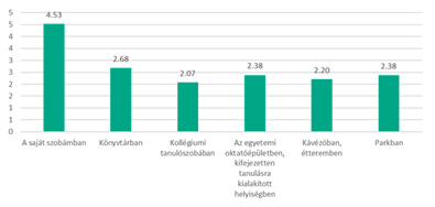 A legnépszerűbb tanulási környezetnek a saját szoba bizonyult. Ettől lényegesen elmarad a könyvtár és az egyetem tanulásra kialakított helyisége. A legalacsonyabb értékelést a kollégiumi tanulószoba kapta – még kávézókban, éttermekben is jobban szeretnek tanulni az egyetemi hallgatók (legalábbis felmérésünk alapján-lásd az 1. számú ábrát).
