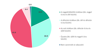 A tanulás helyszíne mellett fontos tényező a napszak is. Nagyon jól kirajzolódik, hogy egy nagy többség inkább a délutánt és egy másik nagy többség az esti órákat preferálja, ha tanulásról van szó. A kitöltők csaknem háromnegyede tehát a déltől éjfélig tartó időszakra időzíti a tanulást. A reggel 6 és dél közötti idősávra összesen a kitöltők 18 százaléka voksolt (lásd a 2. ábrát).