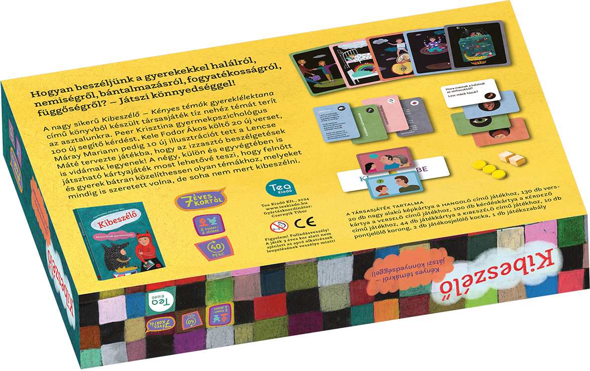 L.M.: Ha fejleszt valamit, akkor nem a gyereket, hanem a családot. A kommunikáció dinamikájában segít, ahogy a társasjáték alapjául szolgáló Kibeszélő – Kényes témák gyereklélektana című segítőkönyv is, csak az másképpen. A játékban előkerülő témák, mint a válás, halál, fogyatékos embertársaink, nem a gyerekek miatt számítanak tabunak, nem ők találták ki, hogy ezekről nem lehet beszélni, hanem ezt tapasztalják. Ezek a témák nem tabuk, csak nehezek. És számos módon meg lehet őket közelíteni, ezekre hoztunk néhány lehetőséget a játékban. Ha végigjátszunk néhány témát, akkor meg fogjuk tapasztalni, hogy nem omlik össze a világ attól, ha bevállalunk nehezebb beszélgetéseket a családdal közösen. Kapunk néhány eszközt, néhány megközelítést, ami segíthet abban, hogy megtaláljuk a saját közös hangjainkat. És ez elképesztően fontos az életben.