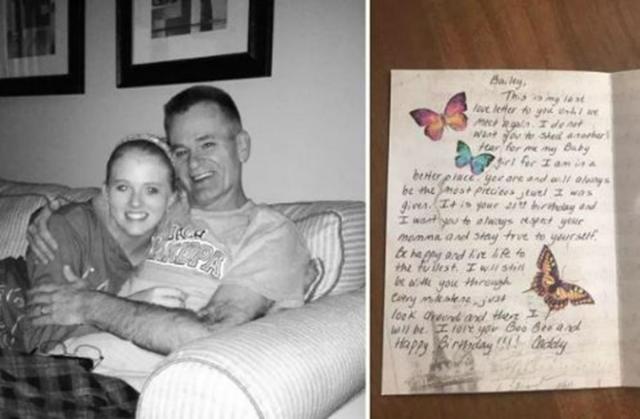 „Bailey, ez az utolsó szerelmes levelem míg újra nem találkozhatunk" – írta az édesapa. "Ne sírj most már értem, kicsi lány, mert jó helyen vagyok. Te vagy, és mindig is te leszel a legdrágább kincs, amit valaha kaptam. Eljött a 21. születésnapod, és én azt kérem, hogy légy mindig tisztelettel anya iránt, és légy mindig hű önmagadhoz. Légy boldog, élj teljes életet. Én továbbra is veled leszek minden fontos állomásnál, csak nézz körül, és megtalálsz. Nagyon szeretlek, Boo Boo, és boldog születésnapot!!!! Apa"