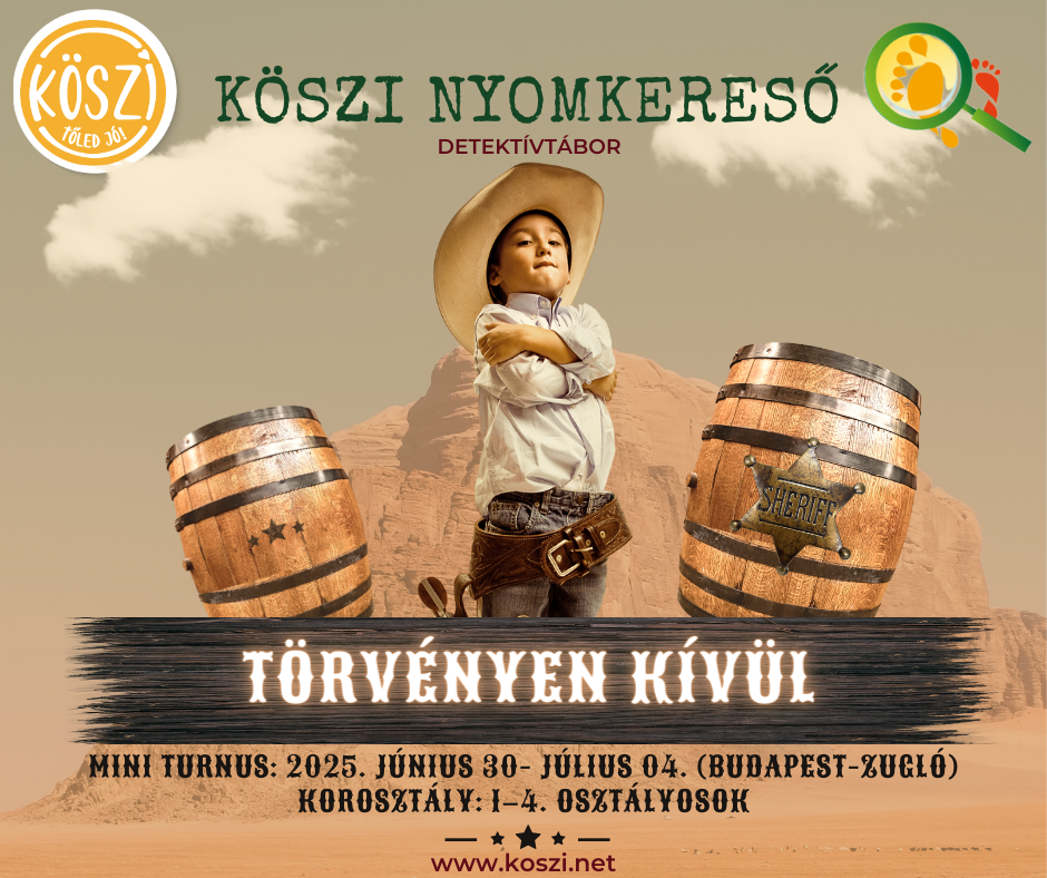 1-4. osztályos kalandorok gyűljetek ide! Minden szemre és fülre szükség lesz, hisz' a KÖSZI tábort ellepték a gazfickók! Ha gyermeked is vágyott már a veszélyes Vadnyugatra, a cowboyok és indiánok, vadlovak és aranymosás világába, szuper hírünk van! Újra megnyitja kapuit a detektívképző tábor, amely idén a western hősök bőrébe bújtatja a résztvevőket, és a legkisebb jelentkezők agytekervényeit is megmozgatja. Szerepjátékok, rejtvények, kalandok és új barátságok várnak itt rád. További részletek a tábor oldalán.