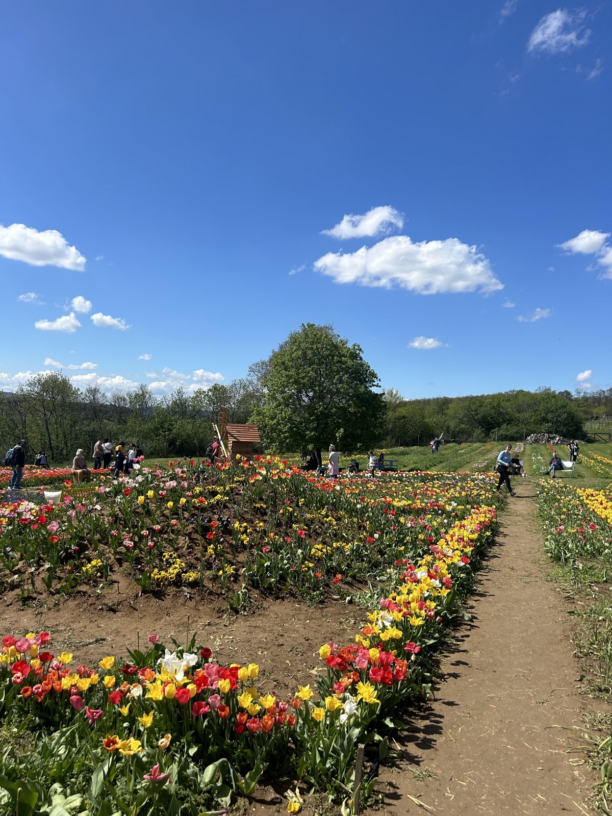 A tulipános kert viszonylag új, 2019-ben alakították ki, hogy már kora tavasszal a színes virágokban gyönyörködhessenek a virágrajongók. A tulipánföld szorgos gazdái kezdetben 20 ezer tulipánhagymát ültettek el, majd évről évre bővítették a tulipános kertet, először 5 ezer majd további 50 ezer tulipánhagyma került elültetésre. 2021-től a rózsaszín, fehér, sárga, piros, fekete, narancssárga, pink, lila és tarka színekben pompázó tulipánok külön-külön ágyásokba kerültek.
