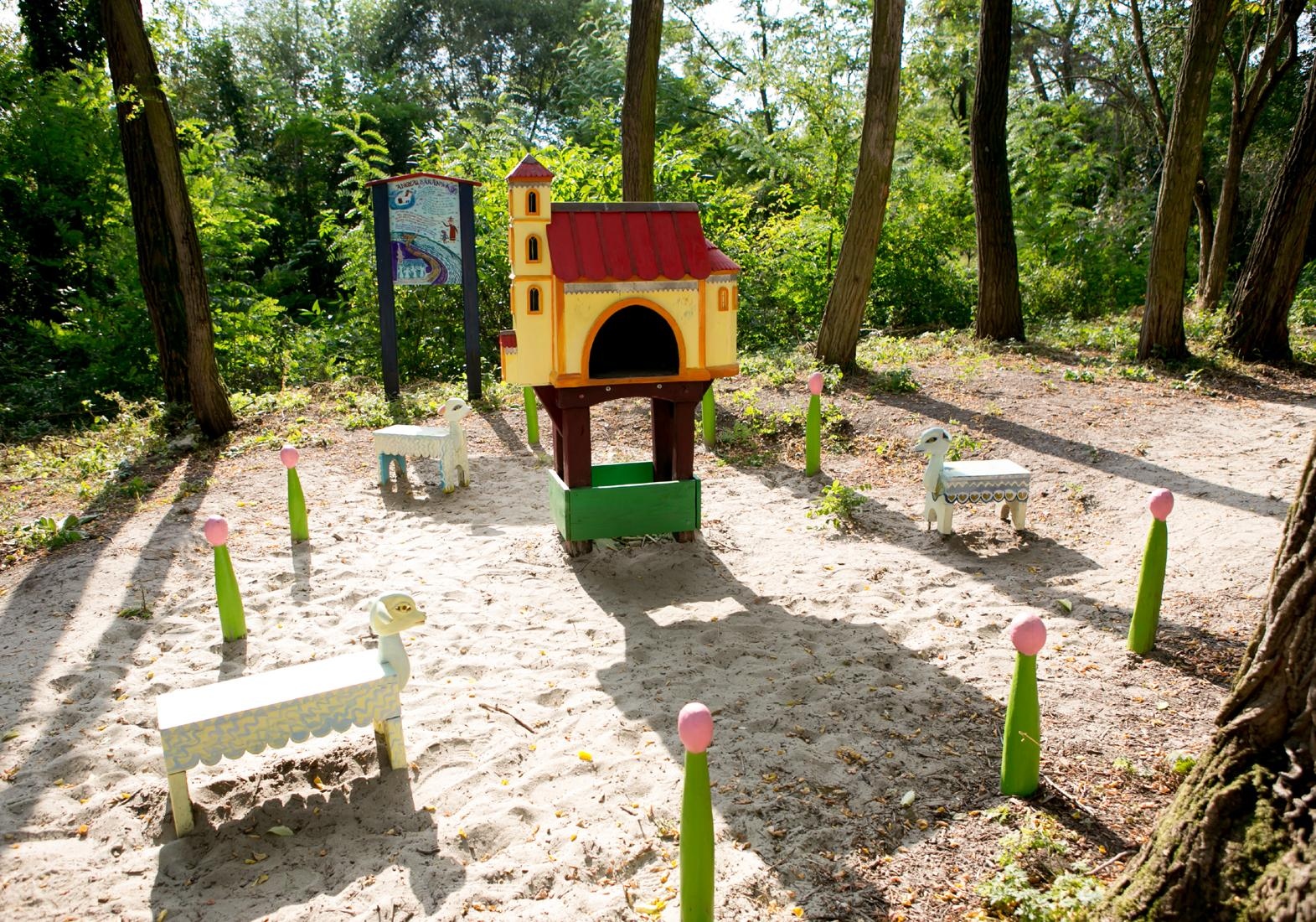 A gyerekek nagy kedvence a patak mentén, a vízimalom mellett található Mesekert játszótér. A Kő Boldizsár által készített játékokon olyan magyar népmesék elevenednek meg, mint A kisgömböc, Az iregi kakasok, Az igazmondó Góbé vagy A kismalac és a farkasok. A mesék pedig nemcsak a játékszereken élhetők át, hanem a helyszínen olvashatóak is, így azok a szülők és gyerekek is ismerősként üdvözölhetik a színes figurákat, akik itt találkoznak először az adott népmesével.