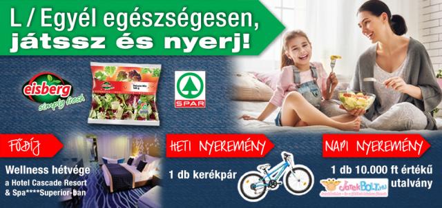 A friss és ropogós salátákkal most nem csupán az egészségünkért tehetünk, hanem játszva nyerhetünk is! Bármely magyarországi SPAR üzletben vásárolt 2 darab Eisberg termékkel napi nyereményként Jatekbolt.hu vásárlási utalványok, heti nyereményként pedig kerékpárok kerülnek kisorsolásra. Az akció végén fődíjként egy frissítő wellness hétvégét tölthet majd el a Hotel Cascade Resort-ban a szerencsés nyertes és családja.
